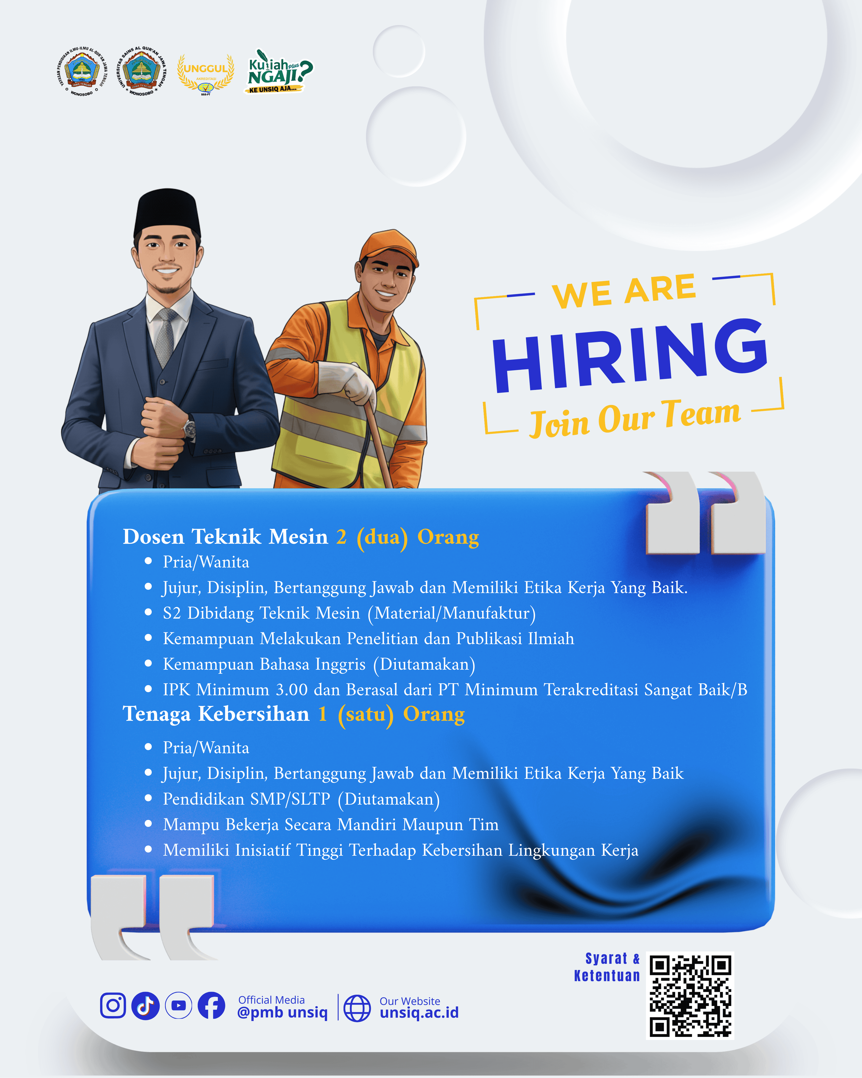 Puji syukur kepada Allah SWT. atas nikmat, karunia, taufiq dan hidaya-Nya. Shalawat salam dan kedamaian untuk Baginda Nabi Agung Muhammad SAW. sebagai panutan dan teladan kita semua. Universitas Sains Al-Qur'an (UNSIQ) Jawa Tengah di Wonosobo yang legal formalnya mulai tahun 2001 berdasarkan surat keputusan menteri pendidikan nasional nomor : 87/D/O/2001 tertanggal 10 juli 2001